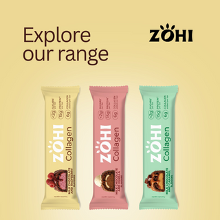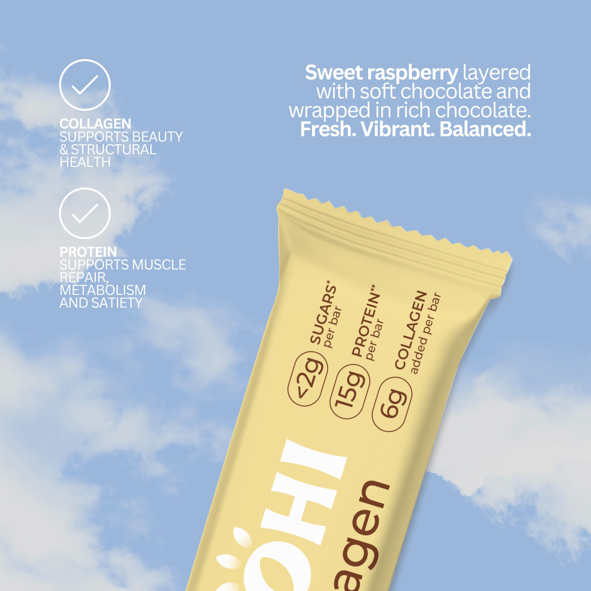 A combination of hydrolysed collagen, protein, raspberry &  rich chocolate for a snack that supports your glow while satisfying cravings, designed to support skin, hair & nails from within whilst still delivering an indulgent treat.